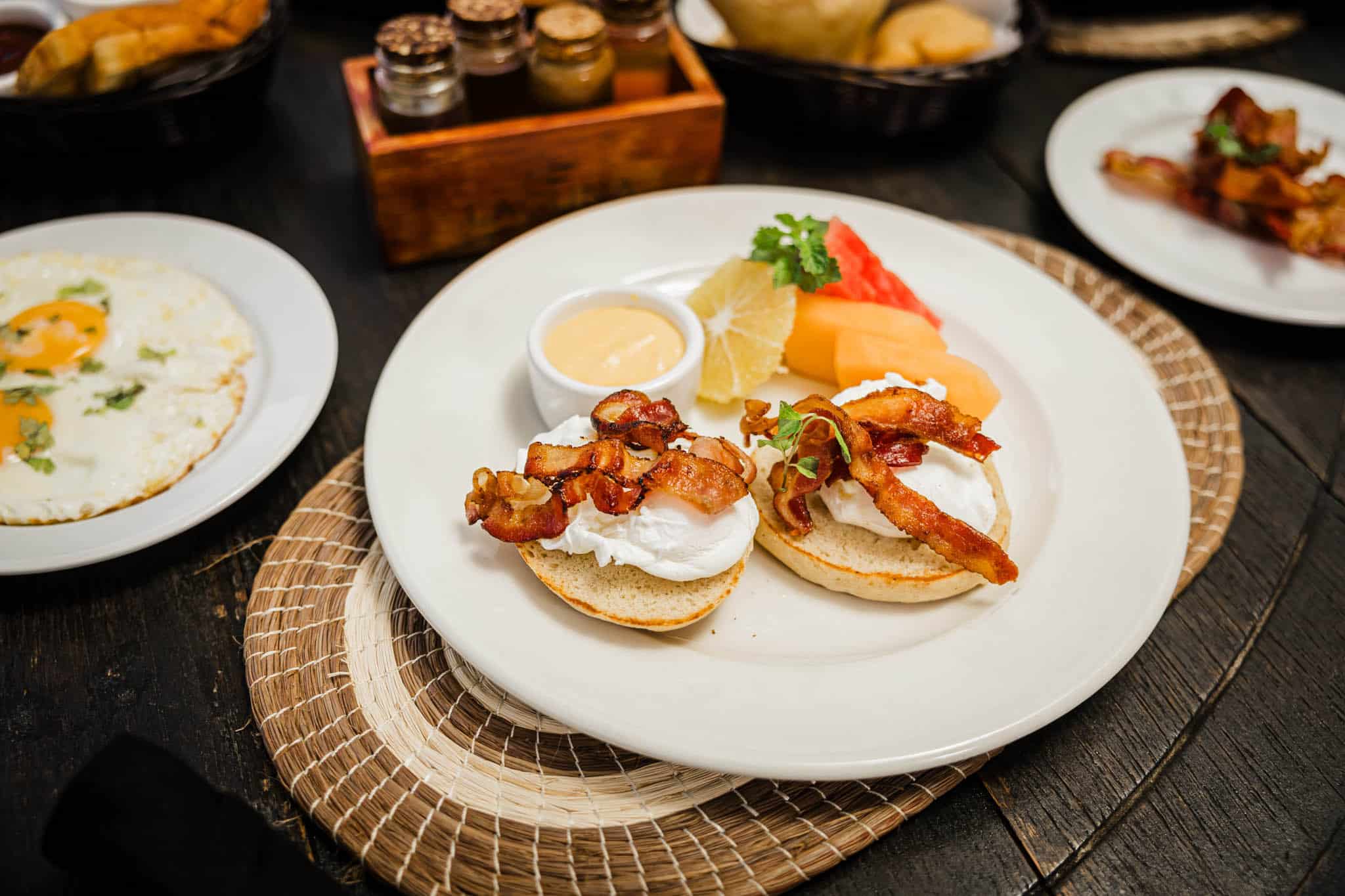 coconut refried beans, crispy bacon and Belizean fried jacks.